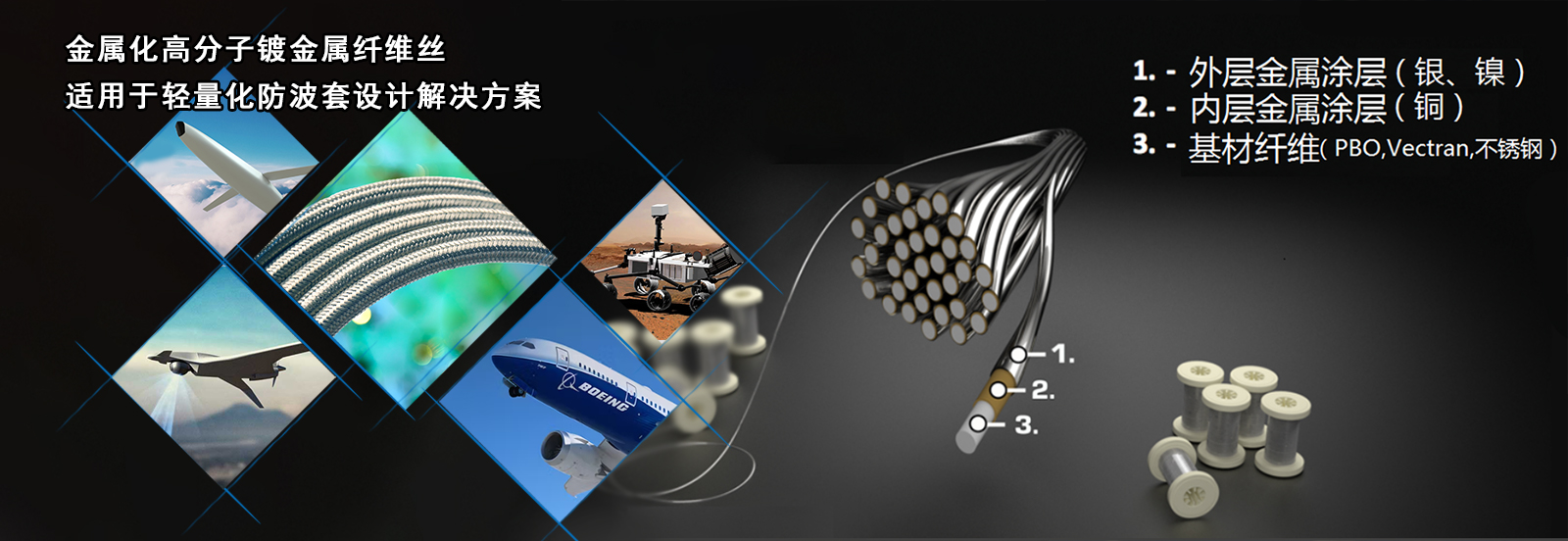 鍍金屬導電纖維絲是在高分子基材上雙層均勻涂鍍金屬,在航空航天線纜減重、機器人電纜屏蔽層、柔性天線、船舶拖曳電纜等減重和強度性能要求高的精密行業(yè)以更高的性能替代標準銅線,用作電纜、線束EMI屏蔽和專用導線。